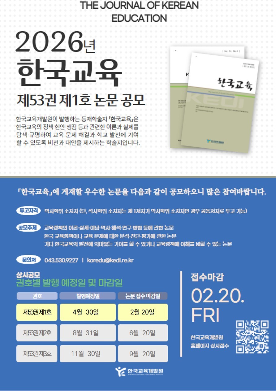 - 한국교육개발원에서 발행하는 학술지「한국교육」은 한국연구재단에 등록된 [등재학술지] 입니다.